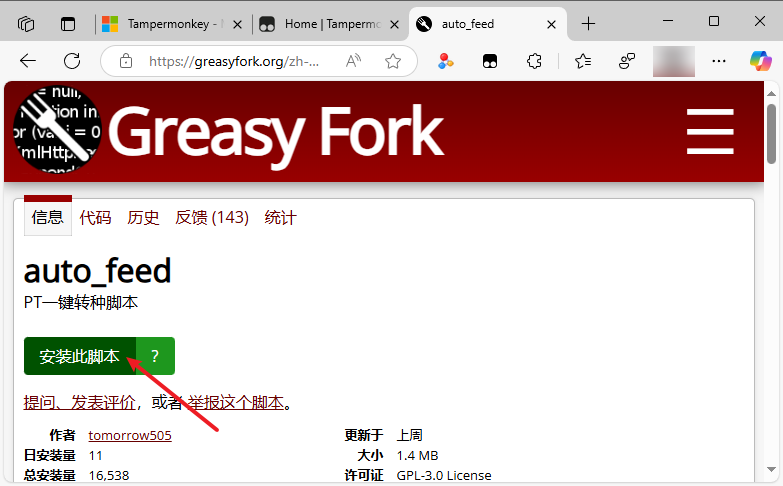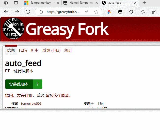 进入脚本地址:https://greasyfork.org/zh-CN/scripts/424132-auto-feed