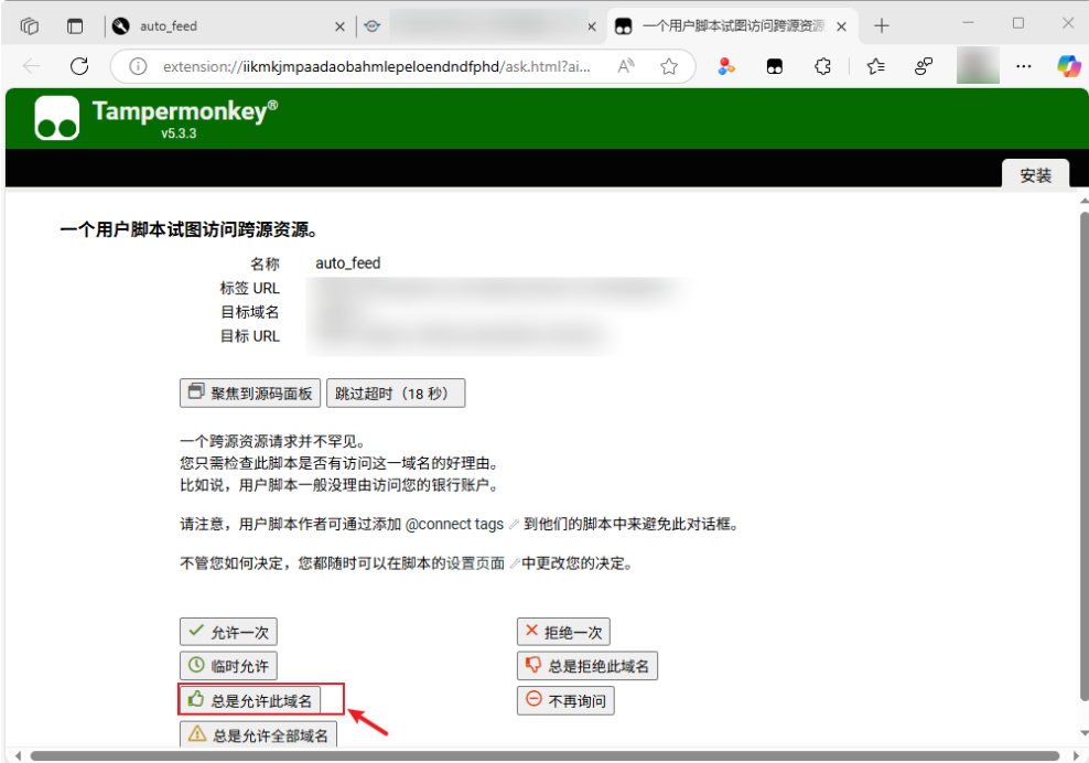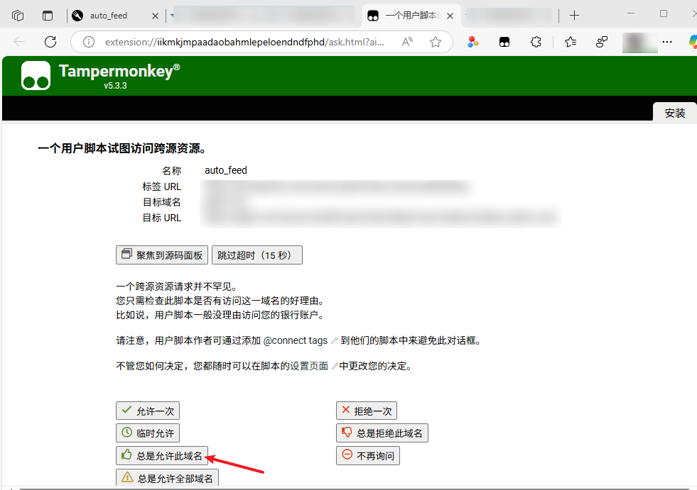打开任意种子的详情页面,会自动弹出如下页面,点击”总是允许此域名“或”总是允许全部域名“以允许auto_feed对网站进行改写