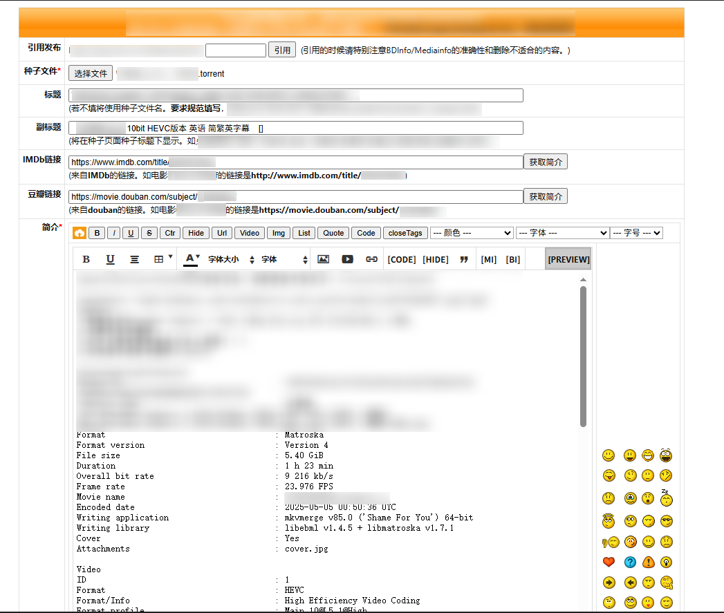 部分站点提供自查脚本,可能会导致转种时标题重复填写2次的情况,注意处理。简介信息丢失