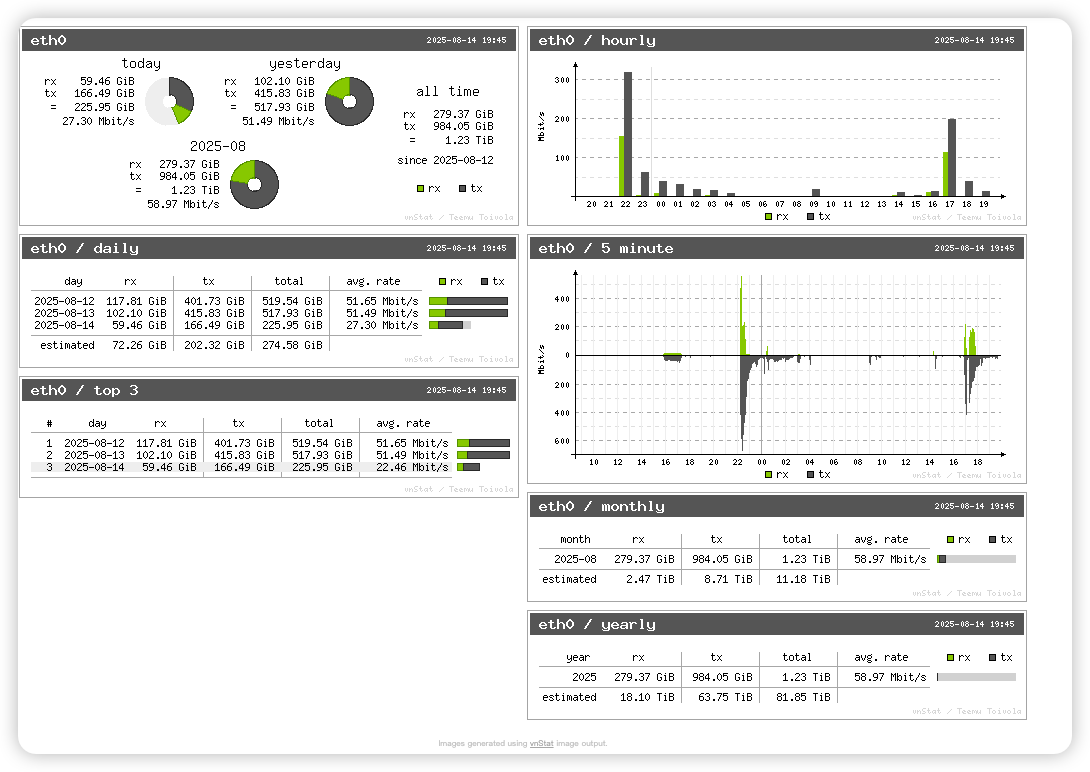 本文将演示如何部署并使用 vnStat,并通过实际输出展示统计结果。
